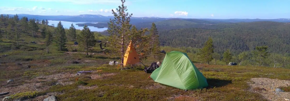 Tolospään huipulta löytyi tasan yksi suojainen paikka teltalle, johon sen laitoin. Olkoonkin, että ei siinä hirmu tasaista ollut.
