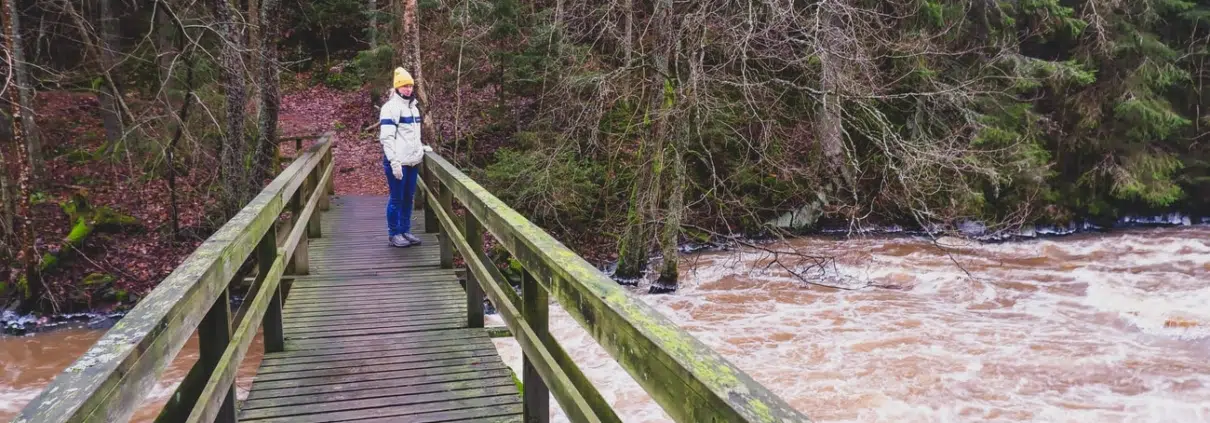 Hetken päästä reitti johdatti takaisin alas, ja siellä odotti toinen silta. Tämä paikka toi mieleeni melkein jopa idän erämaat: koski oli leveä ja komea, metsä nousi sen rannoilla korkeana kaikkialla minne katse ylsi, ja silta oli suhteellisen matalalla veden yllä. Idän vesistä paikan erottikin lähinnä vain Lounais-Suomelle tyypillinen, maitokaakaon värinen vesi.