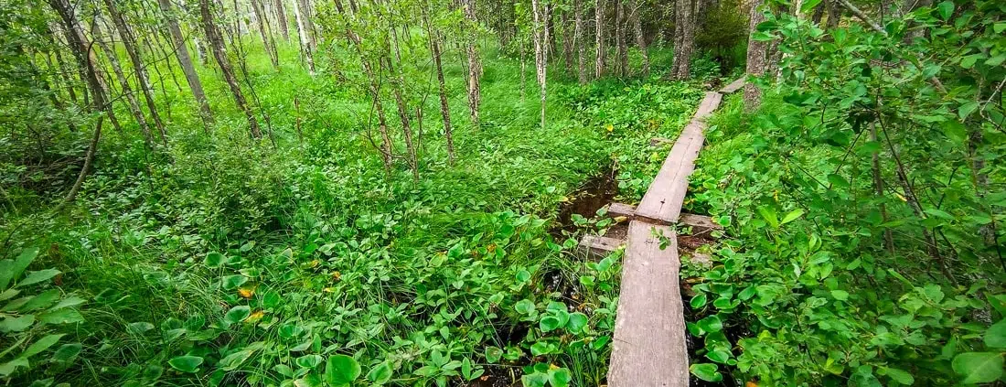 Pro tip: Kansallispuistossahan koira on muutenkin pidettävä koko ajan hihnassa, mutta jos koirasi rakastaa mutaa ja sinä et, suosittelen olemaan erityisen tarkkana täällä. Monin paikoin aivan reitin vieressä oli mustia ja syvän näköisiä mutalampia, jotka varmasti ovat monen koiran suurin unelma, ja jotka tulivat näkyviin niin yllättäen, että koirat varmasti niihin nopeasti myös ehtivät syöksyä ennen kuin hihnan toisessa päässä ehditään reagoida. Tämä vain ystävällisenä vinkkinä, koska ihan lähellä ei ole edes mitään kunnon rantaa, minne koiraa voisi mennä huuhtomaan perusteellisen mutakylvyn jälkeen 🙂