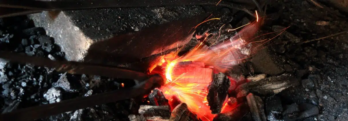 - Käynnissä kirveen teräpalan taonta.