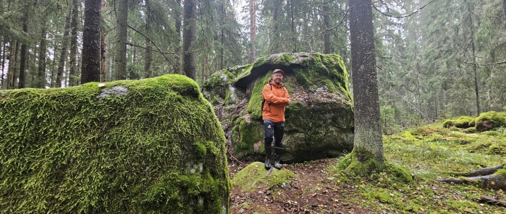 Ahonnokan niemellä on paljon sammalta kasvavia kiviä, jotka varmasti saavat perheen pienimmät kiipeilytuulelle. Minä tyydyin poseeraamaan kahden ison murikan välissä seisoen vähän pienemmän päällä.