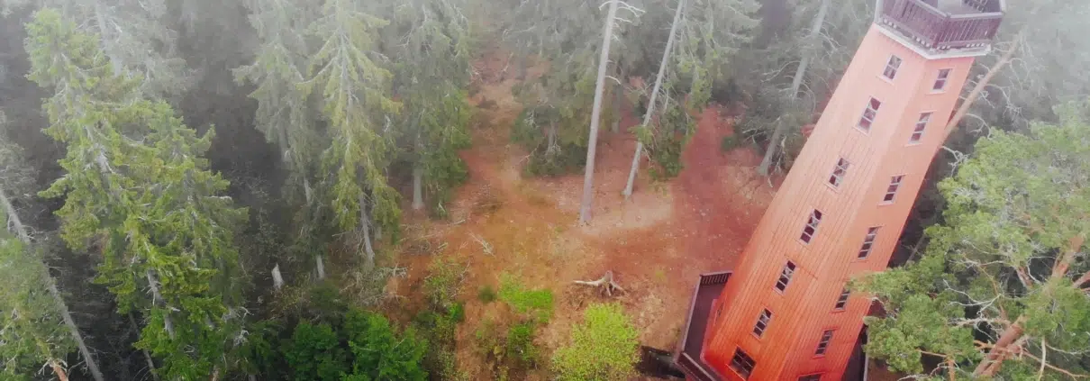 Harjulle nouseva polku on elämys itsessään. Helppokulkuisen polun viertä reunustavat ikikuuset, joiden tuuheat oksastot peittävät taivaankannen. Polku kulkee harjanteen korkeinta kohtaa nousten loivasti ylöspäin, joten se on ihan ajettavissa. Jyrkät rinteet polun molemmin puolin luovat reitille omaleimaisen tunnelman, joka kannattaa käydä itse kokemassa. Tovin poljettuani alkoi mäki loivenemaan, ja kuusien oksien lomasta alkoi sumun keskeltä näkötorni häämöttää.