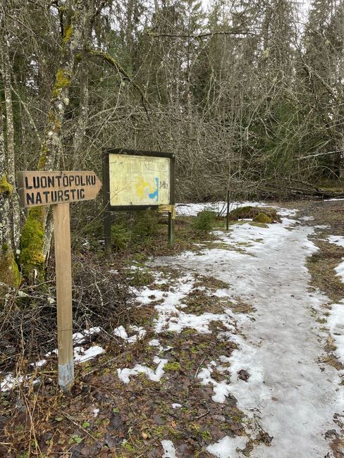 Luontopolun lähtötaulu on jo parhaat päivänsä nähnyt ja oli vaikeasti luettavissa. Luontopolku-viitta ja oranssit merkit puissa varmistavat, että ollaan oikealla polulla. Luontopolun varrella on kohdeopasteita kertomassa alueen luonnosta.