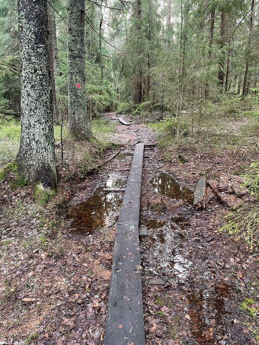 Loppuosa ulkoilureitistä oli sangen mielenkiintoinen sekin. Reitti kulki pitkiä matkoja, ainakin näin keväällä, perin märkiä soita pitkin. Jo taakse jättämäni luontopolun muutamissa märissä kohdissa oli pitkospuut, mutta täällä niitä ei ollut ollenkaan. En päässyt perille siitä, miksi reitti oli viety näin märkiin paikkoihin – voisiko ehkä johtua siitä, että reitti alun perin olisi ollut hiihtoon tarkoitettu? Kiersin märimmät kohdat vähän kauempaa, mikä ei saappaat jalassa ollut mikään juttu sinällään. Kesällä kuivimpaan aikaan reitti on varmaan suo-osuuksilla hieman helpommin kuljettava, mutta veikkaan että saappaat saattavat silloinkin olla tarpeen.