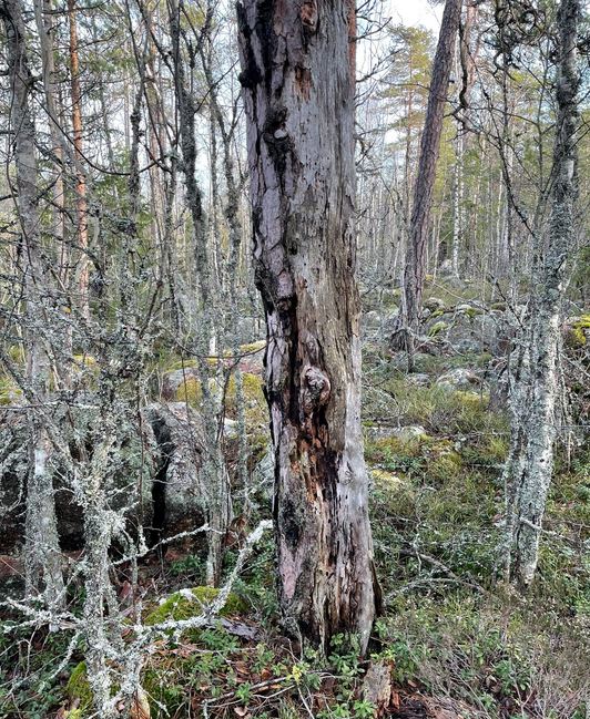 Varjoisan kuusikon jälkeen polku nousee valoisalle kallioalueelle. Siellä pieni viitta ”Paloaukealle 250 m” herätti kiinnostukseni. Polkua paloalueelle ei ole merkitty, mutta polku-ura erottui maastossa. Perille päästyäni kävi ilmi, että paloaukea on hieman harhaanjohtava nimi paikalle, sillä paloalueen puusto on jo liki kymmenmetristä. Palossa mustunut mäntykelo kertoo, että olen oikeassa paikassa. Palasin paloalueelta luontopolulle, puolivahingossa hieman toista uraa kuin olin tullut. Kallion jäkälikössä huomasin ilokseni metson paksuja, karkeita jätöksiä.