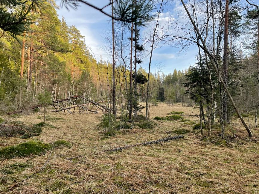 Varjoisassa laaksossa oli vielä hieman lunta maassa. Tässä kohtaa reitin varrelle vasemmalle jäi kaunis, kapea – ja ojittamaton – avosuo eli neva. Päivän aikana selvisi, että alueen muutkin suot ovat pääasiassa ojittamattomia. Kerrassaan upea juttu, sillä jopa kansallispuistojen suot ovat maan eteläosissa usein olleet ojitettuja ennen alueiden suojelua.
