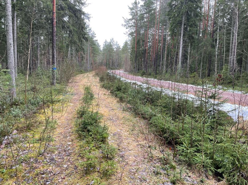 Ulkoilureitti oli merkitty selkeästi sinisin maalimerkein, mutta muutoin reitin alku ei ollut kovin hohdokas. Alussa reitti kulki soratien yli, sitten vanhan soranottoalueen läpi, jonka jälkeen polku haarautui. Lähdin kulkemaan oikeanpuoleista haaraa ja näin ollen kiertämään ulkoilureittiä vastapäivään. Tästä kuljettiin vielä puolisen kilometriä soratien laitaa, kunnes reitti vihdoin kaartoi metsään.