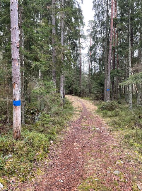 Iloisena jatkoin matkaani sinisellä merkittyä ulkoilureittiä pitkin. Kummeksuin sitä, että polulla oli tehty pieniä maansiirtotöitä, ilmeisesti maastopyöräilyn helpottamiseksi. Olikohan tuo nyt ollut ihan tarpeellista kuitenkaan? Onneksi tämä osuus oli lyhyt ja pian palattiin luonnon polkuun kallioiseen mäntymetsään. Polun varrella oli metson pienemmän sukulaisen, eli teeren jätöksiä. Lämmitti kovasti mieltä, että näitä komeita, kovasti harvinaistuneita kanalintuja vielä näistä metsistä löytyy!