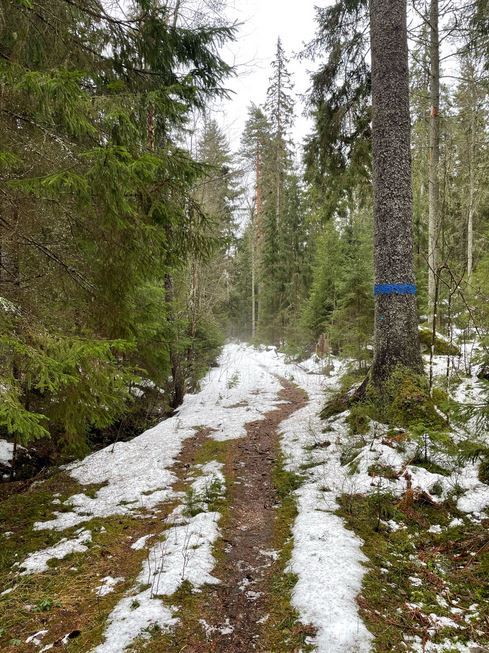 Metsässä reitti noudatti vanhaa ajouraa ja oli helppokulkuinen. Saatoin hyvin keskittyä ihailemaan ympäröiviä metsiä. Kallioalueilla oli hienoja, valoisia männiköitä ja laakson varttuneissa kuusikoissa oli mukavasti lahopuuta – merkki siitä, että ulkoilualueen metsissä ei juurikaan liene hakkuita tehty, hyvä niin! Kuulostelin äänimaisemaa – metsä oli hiljainen, mitään auto- tai lentoliikenteen ääniä ei myöskään kuulunut. Korkeiden kuusten latvoissa touhusi tiaisparvi ja kauempana tikka nakutti puun runkoa. Selvästikään rastaat, peipot ja muut aikaiset muuttolinnut eivät vielä olleet saapuneet.