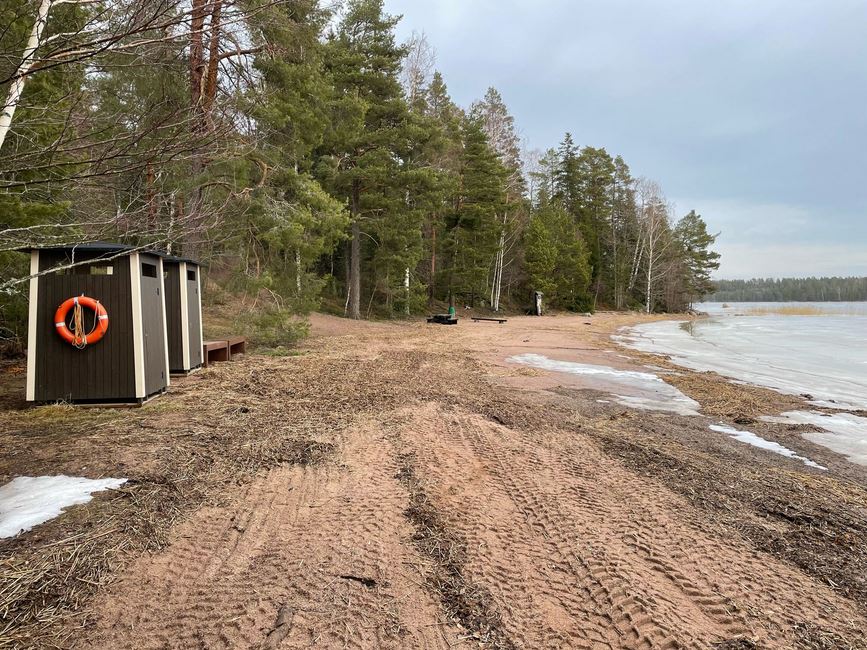 Hiekkapohjainen uimaranta löytyy muutama sata metriä parkkipaikan eteläpuolelta. Rannan tuntumasta löytyy myös tulentekopaikka ja puucee, hieman erikoisesti välittömästi frisbeegolfin heittopaikan vierestä. Istuuduin penkille ja pidin pienen tankkaustauon. Katson autiota hiekkarantaa, nostan kiikarit silmille ja seuraan hauraalla kevätjäällä nahistelevia variksia. Kauempana näkyi pieniä luotoja. Vaaleat, kuolleet puut luodoilla todistavat niiden olevan merimetsojen pesimäsaaria. Merimetsojen ja muiden vesilintujen palaamista saadaan kuitenkin vielä odotella muutaman viikon.