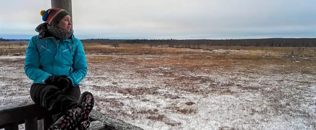 Käännyimme siis lopulta kannoillemme ja lähdimme marssimaan takaisin kohti Teurajärveä. Matkalla pysähdyimme vielä lintutornille, johon kiipesimme katsomaan maisemia. Pilvinen ilma väritti harmaaksi koko alueen. Olisi ollut mukava tietää, näkeekö paikalta Ylläksen alueen tunturit jos taivas olisi ollut selkeä ja horisontti kirkas.