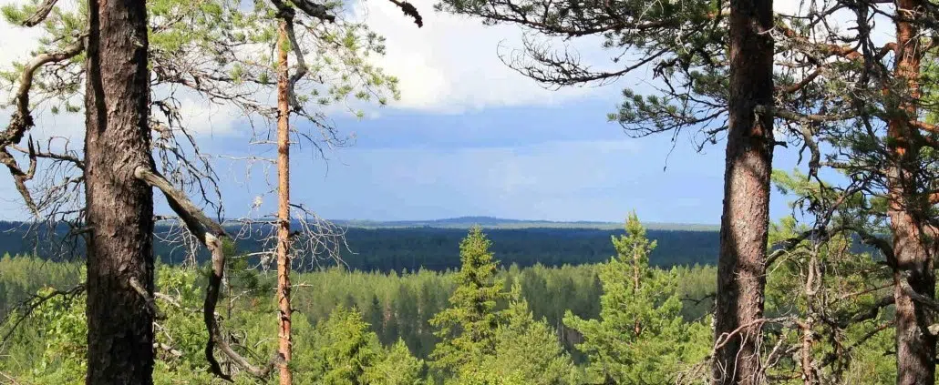 Tästä pohjoiseen polkua kulkemalla saavutaan näköalapaikalle – mikä upea maisemapaikka! Peltojen ja metsien täyttämä Pohjanmaakin avautuu puiden raosta alavana.