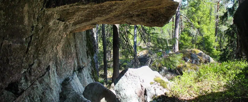 Kallion laella on muutamien suurten siirtolohkareiden lomassa aivan asumiseen ja oleskeluun viittaavia luolamaisia syvänteitä.