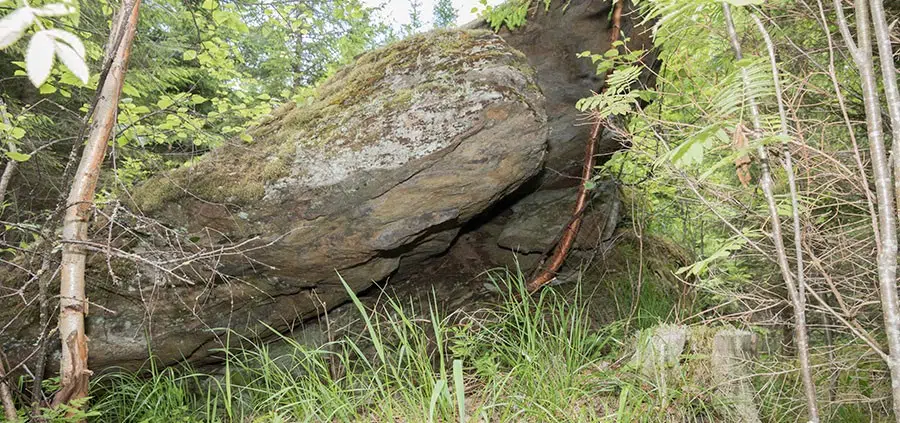 Sukelsin talouskuusikkoon ja sieltähän löytyi iso kivi halenneena useaan osaan. Suurimmassa halkeamassa oli kasvanut suuri pihlaja, joka nyt lahos ja tilalle oli nousemassa kuusia.