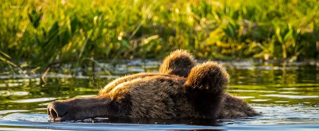 Seuraava karhu tulee näyttämölle vasta parin tunnin kuluttua, ja siinä ajassa olen ehtinyt tuskastua kojun lämpöön ja seisahtuneeseen ilmaan. Hikeä pukkaa pelkästään paikallaan istuen, ja tiedoksi vain, ettei tuulettaminen ole mahdollista, etteivät karhut saisi kuvaajan tuoksua nenäänsä. Tuska helpottuu kuitenkin heti, kun seuraava nalle saapuu paikalle ja pulahtaa sulavasti lampeen uimaan. Se tuhisee ja puhisee, mutta selvästi nauttii uintihetkestään. Pienen uintilenkin jälkeen se kömpii taas lammesta ja poistuu paikalta. Tässä vaiheessa iltaa nallet on mielestäni aivan ihania!