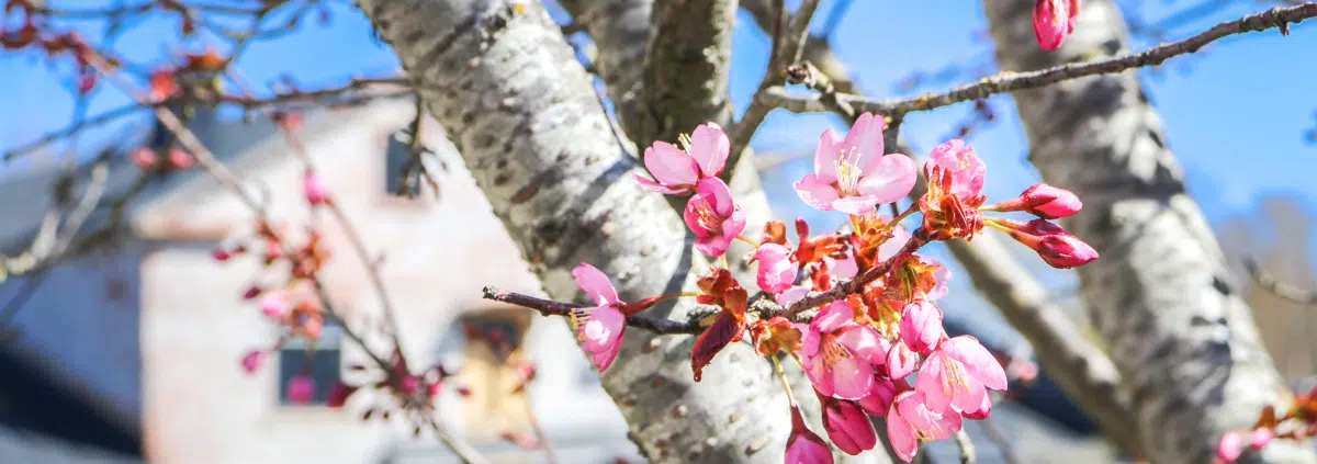 Vasarasepäntieltä suuntaamme alas jokirantaan ja löydämme jälleen lisää kirsikkapuita. Täältä alempaa on myös hyvä kuvakulma kenties koko ruukin somimpaan, punaiseen rakennusrivistöön ja niiden takana kohoaville kallioille.