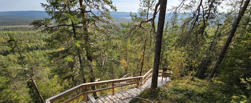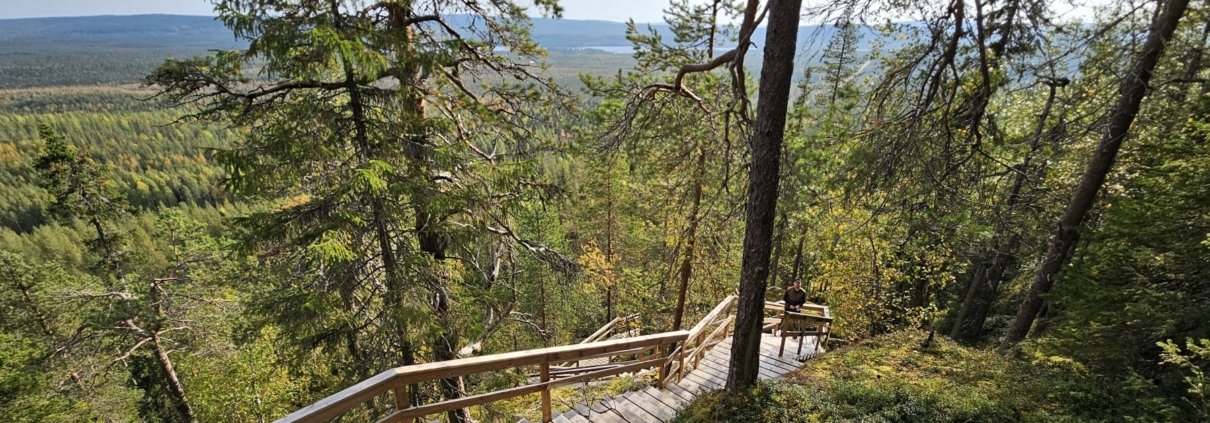 Kohokohdat: Upeat ja avarat maisemat Pallistajanvaaran huipulta, hieno portaikko vaaralta laskeutuessa.