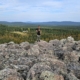 Laavulla oli siellä yöpynyt retkeilijä aamutoimissaan. Sanoimme huomenet ja kävelimme muutaman metrin sivummalle katselemaan maisemaa. Idässä siintää Puolamajärvi ja sen takana vuoret, joilla on erikoinen nimi, Kiukaat.
