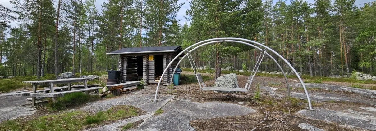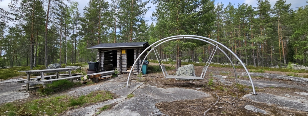 Taukopaikalle tulin noin 1,6 kilometrin kävelyn jälkeen. Puukatoksen, tulipaikan ja piknikpöydän lisäksi täällä on mainio istuskelu- tai levähdysmahdollisuus varsin erikoisessa keinussa.