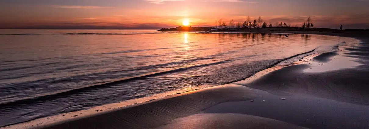 Alueen rannoista tulee enemmän mieleen jokin rantalomakohde kuin tavalliset Suomen uimarannat, ellei näin huhtikuussa maassa olevaa lunta oteta huomioon. Laskeva aurinko lisää tunnelmaa painuessaan kauas horisontin taakse ja saa kiireisimmänkin kaverin pysähtymään…