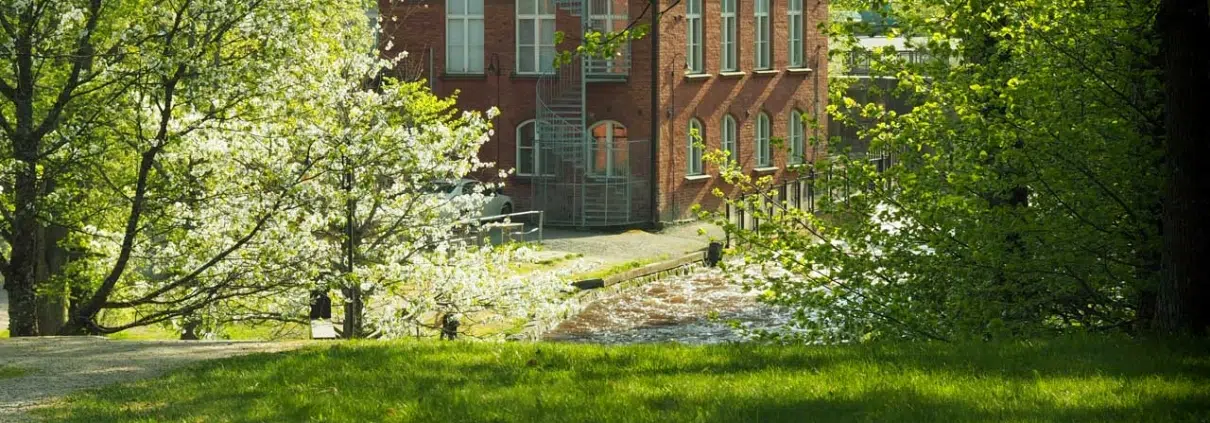 Puiden välistä puistoon kurkistelee tehtaan näyttävä piippu, jota on vuosien saatossa lyhennetty jo kahdesti. Ennen 50 metriä korkea piippu on nyt vain 36-metrinen.