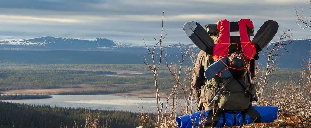 Packraft-matkoillani kannettavaa tavaraa riittää yllin kyllin, enkä saa kaikkea millään sullottua rinkkani sisäpuolelle. Kuvassa näkyvät melontavälineet sekä itse packraft (”kajakki”) ovat rinkkani ulkopuolella.
