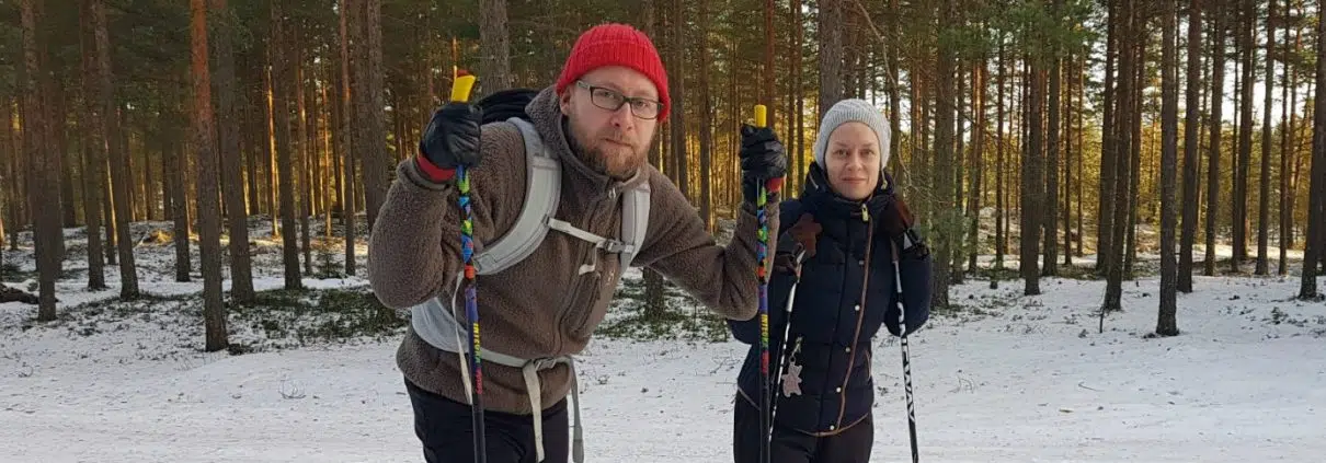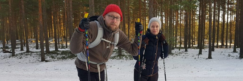 Tuntemattomille olisin aloittanut opettamalla sauvoitta hiihtoa ja yhdellä suksella hiihtämistä. Opettaminen tutuille on jotenkin vaikeampaa kuin tuntemattomille, joten oikaisin vähän. Jussi ja Jaana oppivat nopeasti, vaikka muutama maakosketus matkalla sattuikin. Kun ensimmäinen kilometri oli hiihdetty, tasapaino alkoi löytyä ja hiihto sujua.