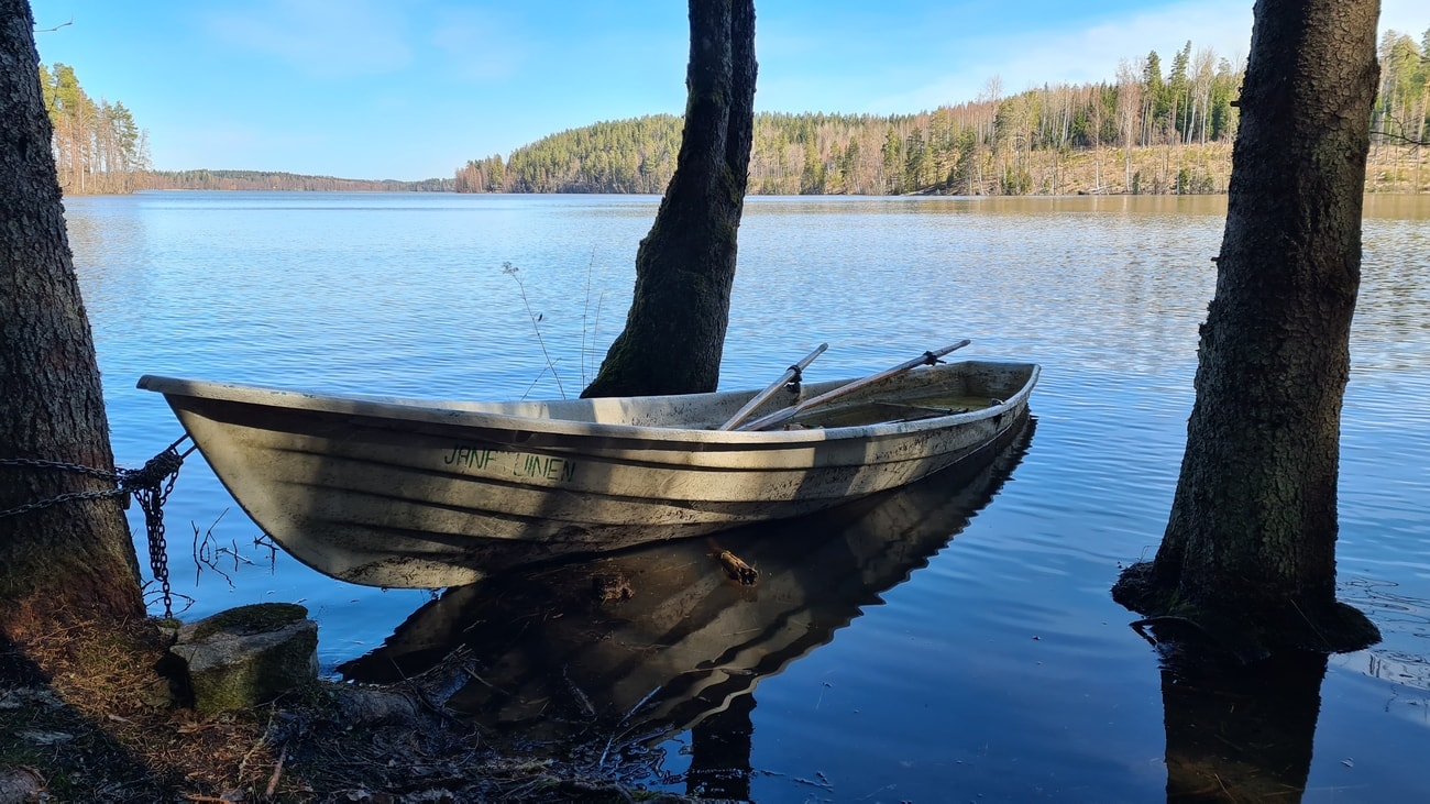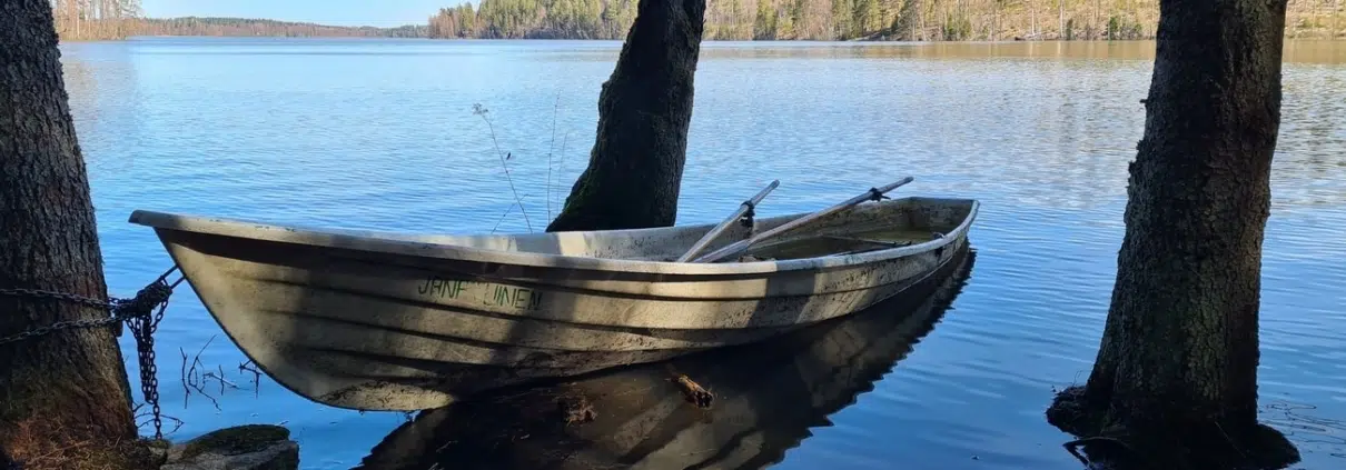 Rantaosuutta on noin 500 metriä. Saavutaan venevalkamaan, josta reitti kääntyy pois rannasta – täälläkin on selkeä punainen merkki näyttämässä suuntaa.