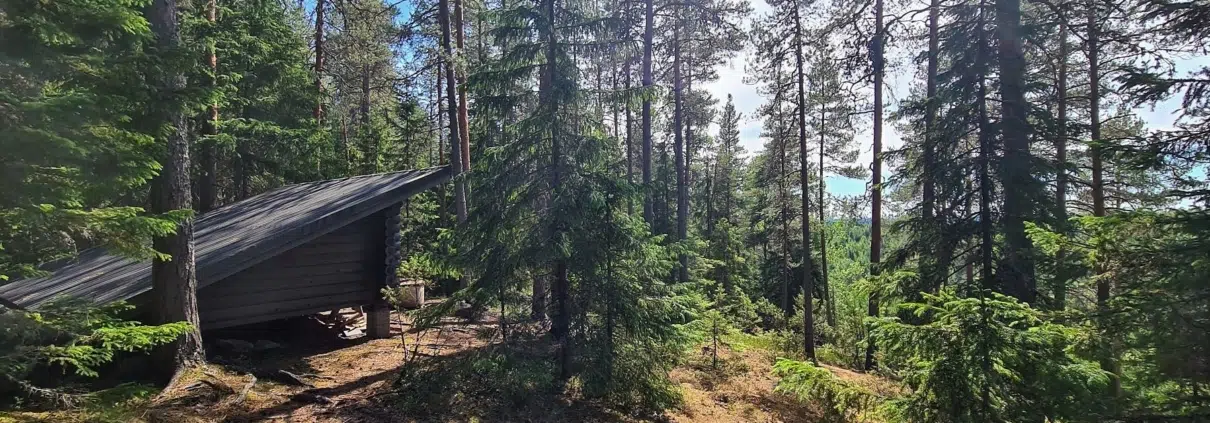 Kapeahko metsätie alkaa nousta mäkeä ylös. Hetken kuluttua erotaan metsätiestä ja lähdetään taas kapeammalle polulle. Tässä on pieni katos, josta voi ottaa polttopuita mukaan laavulle.
