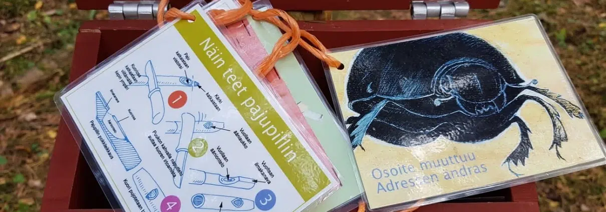 Mäen päällä saavutaan ensimmäiselle punaiselle postilaatikolle. Postilaatikoissa on siis laminoituja postikortteja, joissa eläimet (tai kasvit) ovat lähettäneet viestejä toisilleen. Jokaisessa laatikossa on useampi kortti – niiden lukemiseenkin piti varata vähän aikaa. Ensimmäisessä postilaatikossa pajulintupari oli pistänyt kortin pyrstötiaisten suvulle.