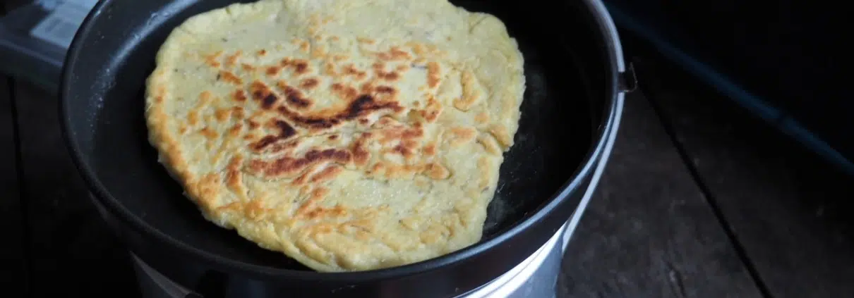 Sekoita perunamuusijauhe ja kuuma vesi ja anna muusin jäähtyä. Lisää loput aineet ja sekoita tasaiseksi. Kotona kannattaa valmistella sen verran, että sekoittaa munajauhon sekä vehnäjauhot että mausteet valmiiksi. Lisää öljyä trangian pannulle ja muotoile haluamanlaisesi rieska paistumaan. Rieska on valmis, kun pinta on saanut hieman väriä ja se ei ole enää sisältä taikinainen.