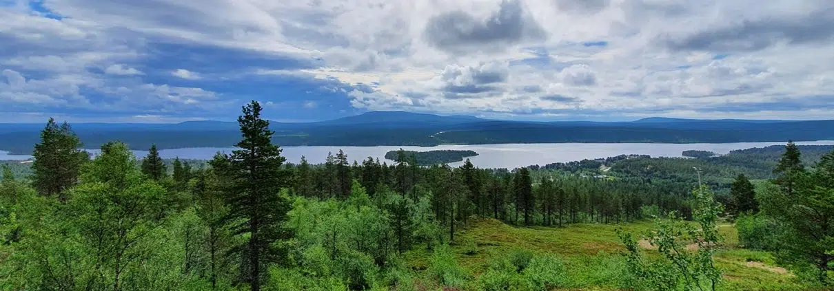 Katselemme alas Ounasjärvelle, näemme sen takana Pallas-Ounastunturien ketjun, ja kurkistamme vielä vaaran toiselle puolelle pohjoiseen.