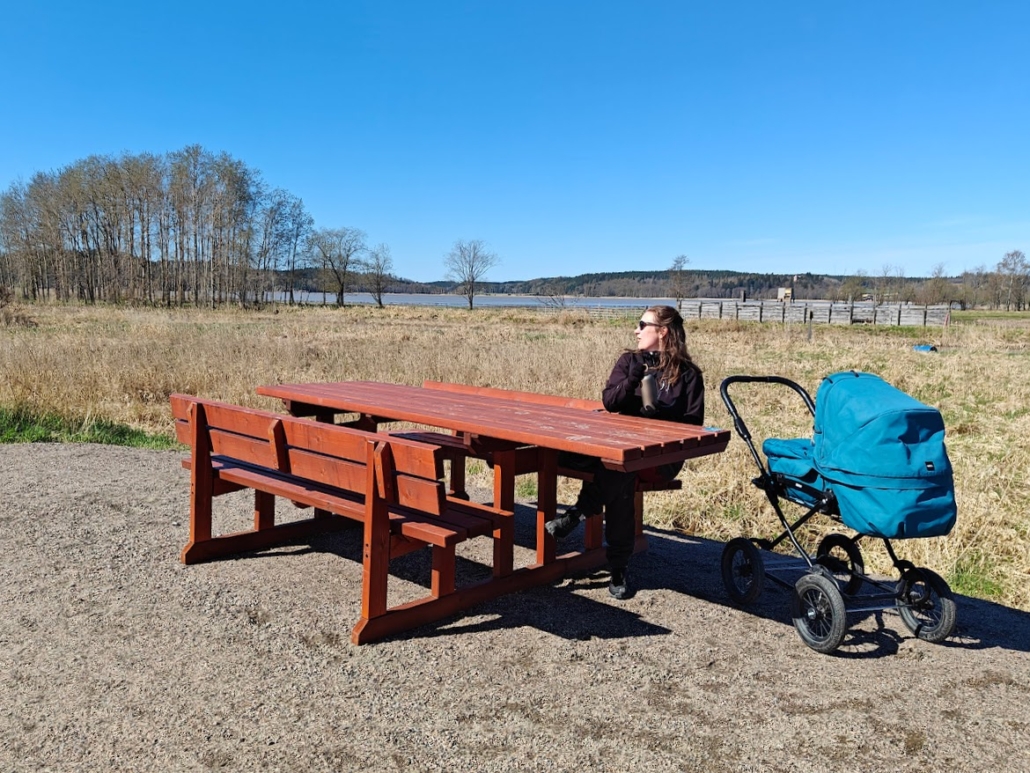 Katselulavalla on myös penkki, ja rakennelman edustalla pöytäryhmä. Pöydän päästä on varattu paikka pyörätuolia käyttäville. Tunnen mielessäni hurjan suurta iloa siitä, että tällainen reitti ja paikka on olemassa ja palvelee ihanalla tavalla paitsi vauvaperheitä ja pyörätuolia käyttäviä, myös monia ikäihmisiä tai muita, jotka tarvitsevat esteettömyyttä luonnosta nauttimiseksi. Oikeus nauttia luonnosta ja ulkona liikkumisesta kuuluu kaikille.