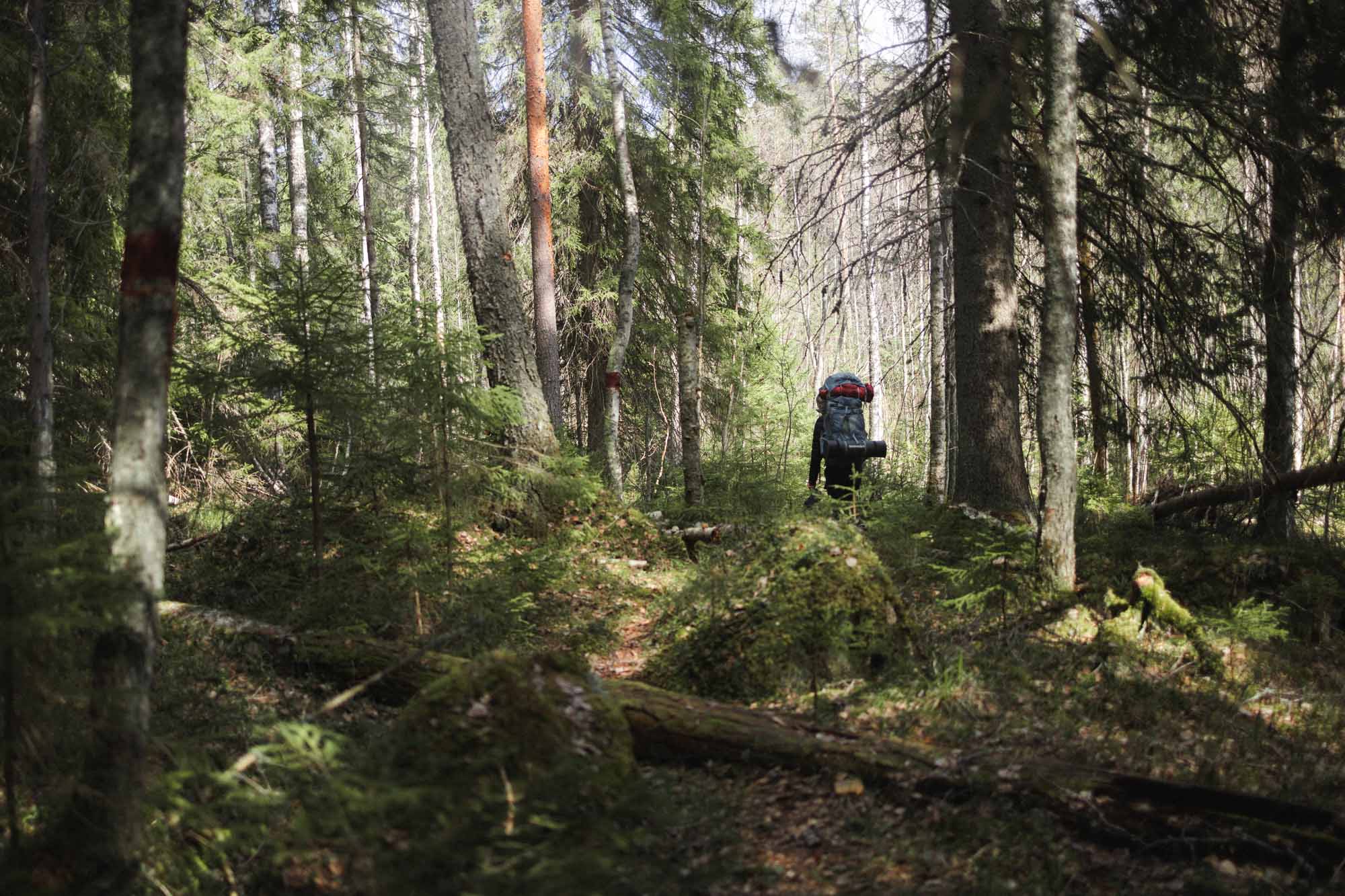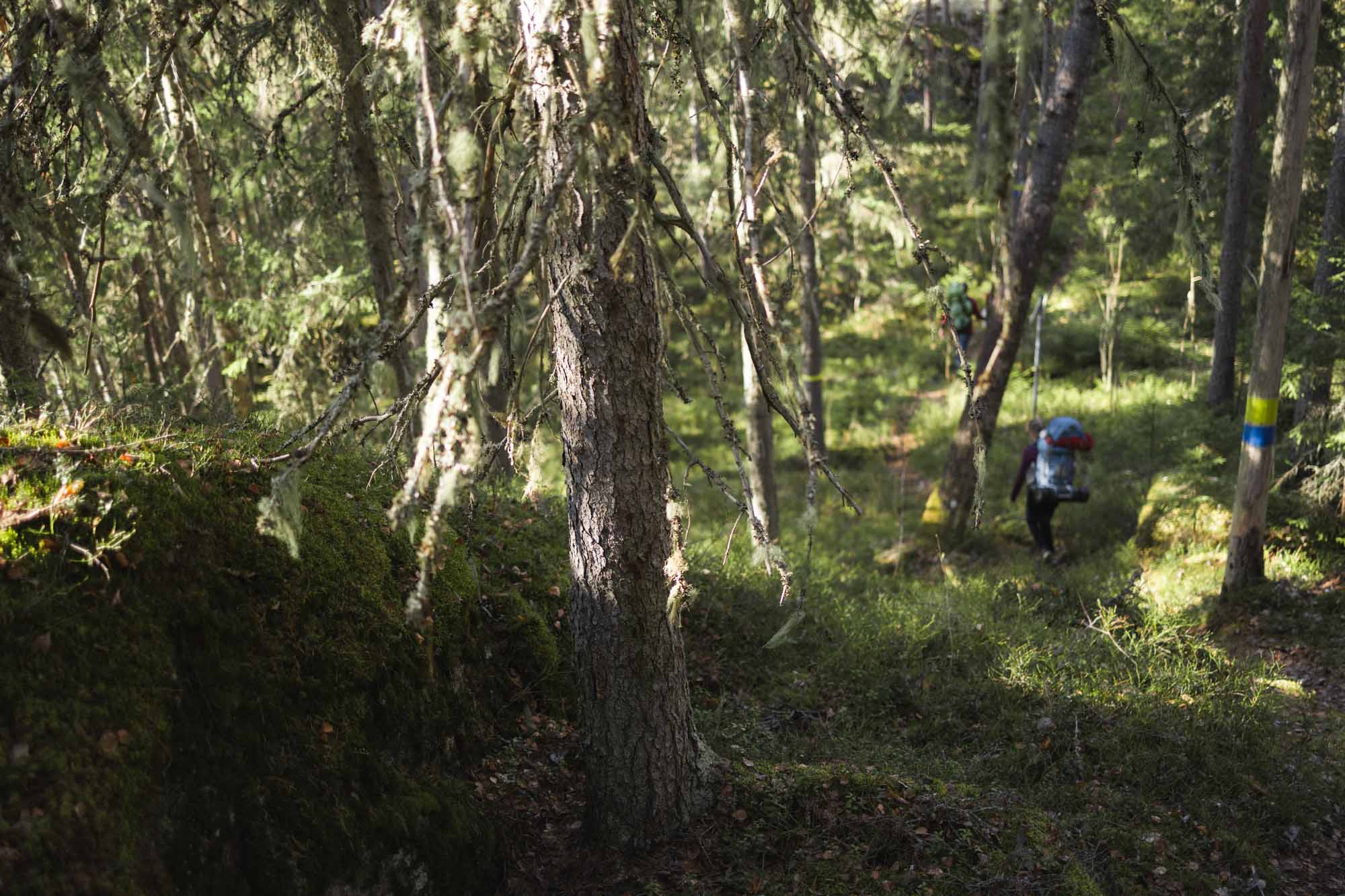 Päiväkahvien jälkeen oli aika taas heittää rinkat selkään ja jatkaa matkaa. Seuraava osuus vaikutti selvästi uudemmalta. Reitti näytti juuri merkityltä ja polku katosi paikoin metsään, mutta ehkä siksi se tuntui myös erityisen mielenkiintoiselta.
