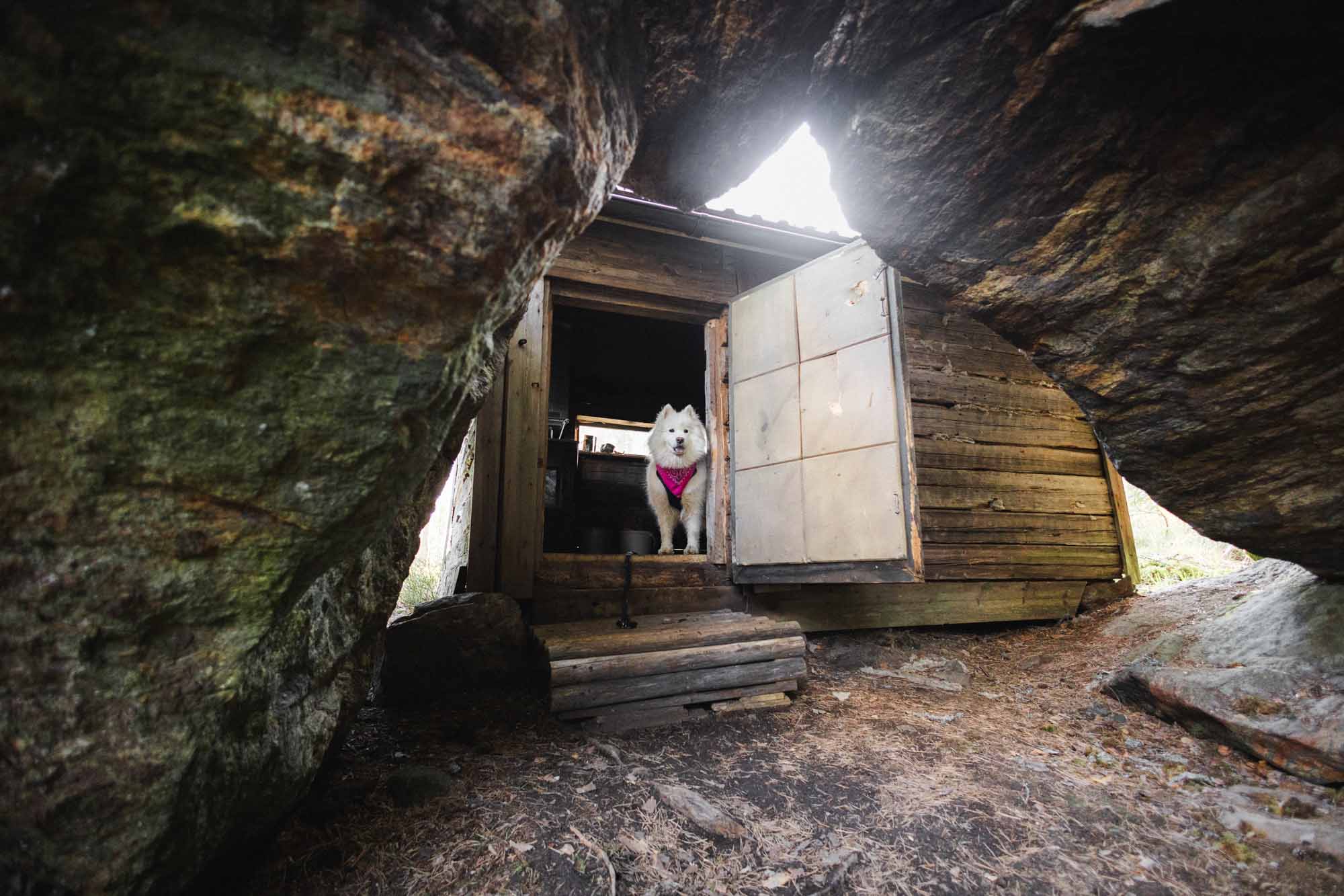 Enkelinpesän tupa oli mielenkiintoinen, eipäs ole tällaista tullut ennen vastaan! Jouduimme vähän aikaa etsimään tuvan ovea, sillä se oli tehty kalliolohkareiden suojaan huomaamattomaan paikkaan. Sisältä löytyi kamiina, joten tässähän voisi yöpyä kylmemmälläkin kelillä. Kyltin mukaan tupaa ylläpitää paikallisyhdistys, ja paikkaa sekä polttopuita saa käyttää pientä korvausta vastaan.