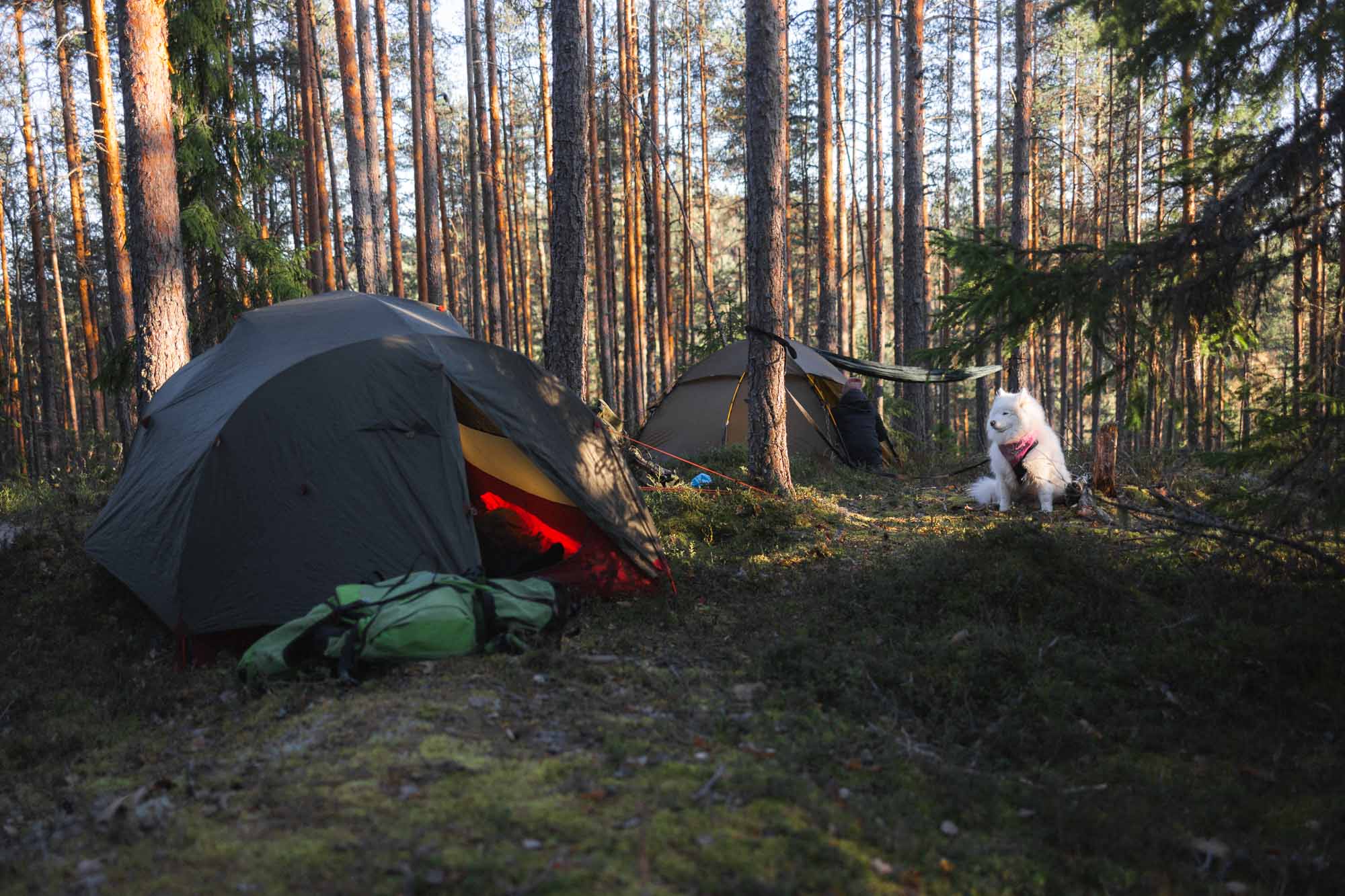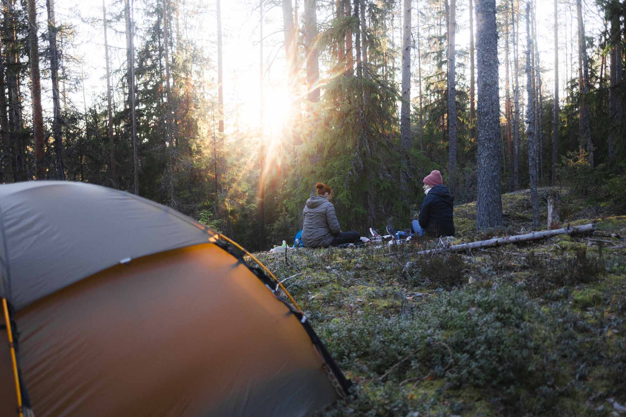 Elinan keittämän kalakeiton tuoksut alkoivat jo kantautua nenään, kun me pystytimme Netan kanssa telttoja metsään pienellä tasaiselle kohdalle, joita ei kovin montaa lähistöltä löytynyt. Saimme kuitenkin teltat pystyyn ja ehdimme iltapalalle juuri ennen auringonlaskua.
