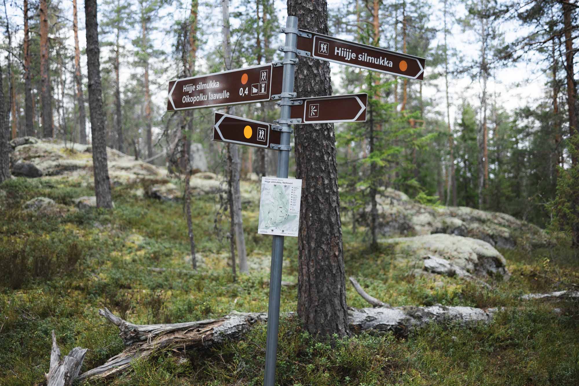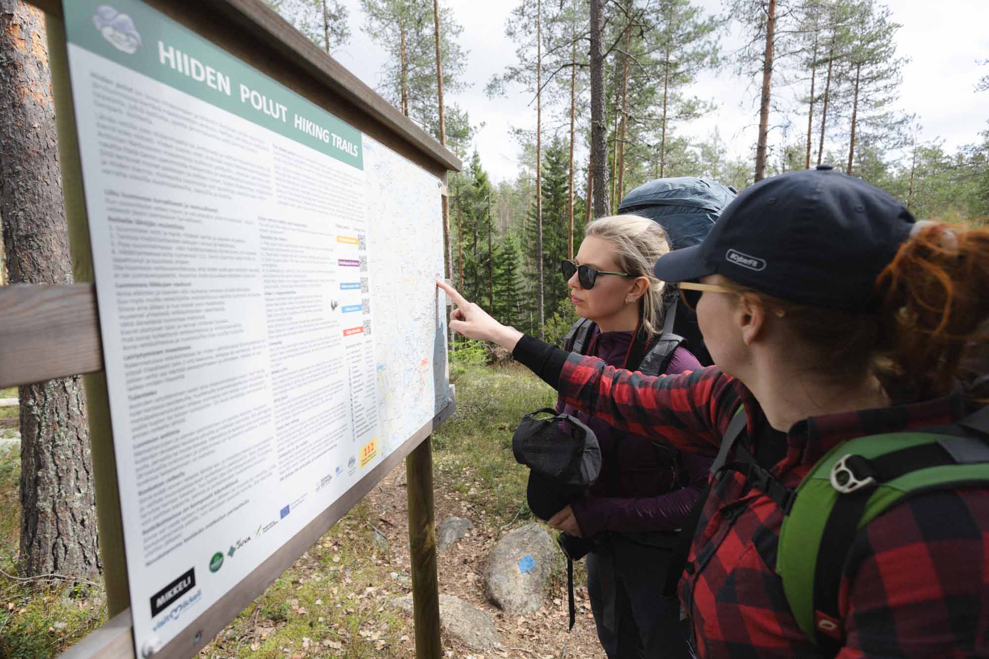 Vaikka reitti oli selkeä, onneksi risteyksissä oli nähtävillä karttoja, sillä alueella kulkee myös muita polkuja, joilla on mahdollisuus tehdä eri pituisia retkiä. Tästä olisi voinut jatkaa Hiidenkodalle, mutta suuntasimme kohti kauempana sijaitsevaa Enkelinpesää, jossa oli tarkoitus viettää tuleva yö.