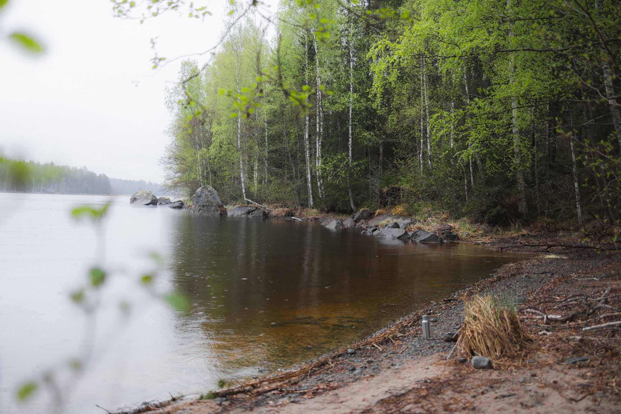 Pienen lammen rannassa matkaa alkoi olla sen verran takana, että päätimme pitää siinä ruokatauon. Samalla saisimme vettä ruokaan ja kahviin. Olimme kyllä jo täytelleet juomapulloja hiekkapohjaisista puroista, joita oli löytynyt ajoittain reitin varrelta. Pohdimme, että näin alkukesästä vesi oli vielä todennäköisesti hyvää, mutta toimimme toki tietoisella riskillä, sillä veden puhtaudesta ei koskaan voi mennä täysin takuuseen. Järvivesikin vaikutti kyllä raikkaalta.