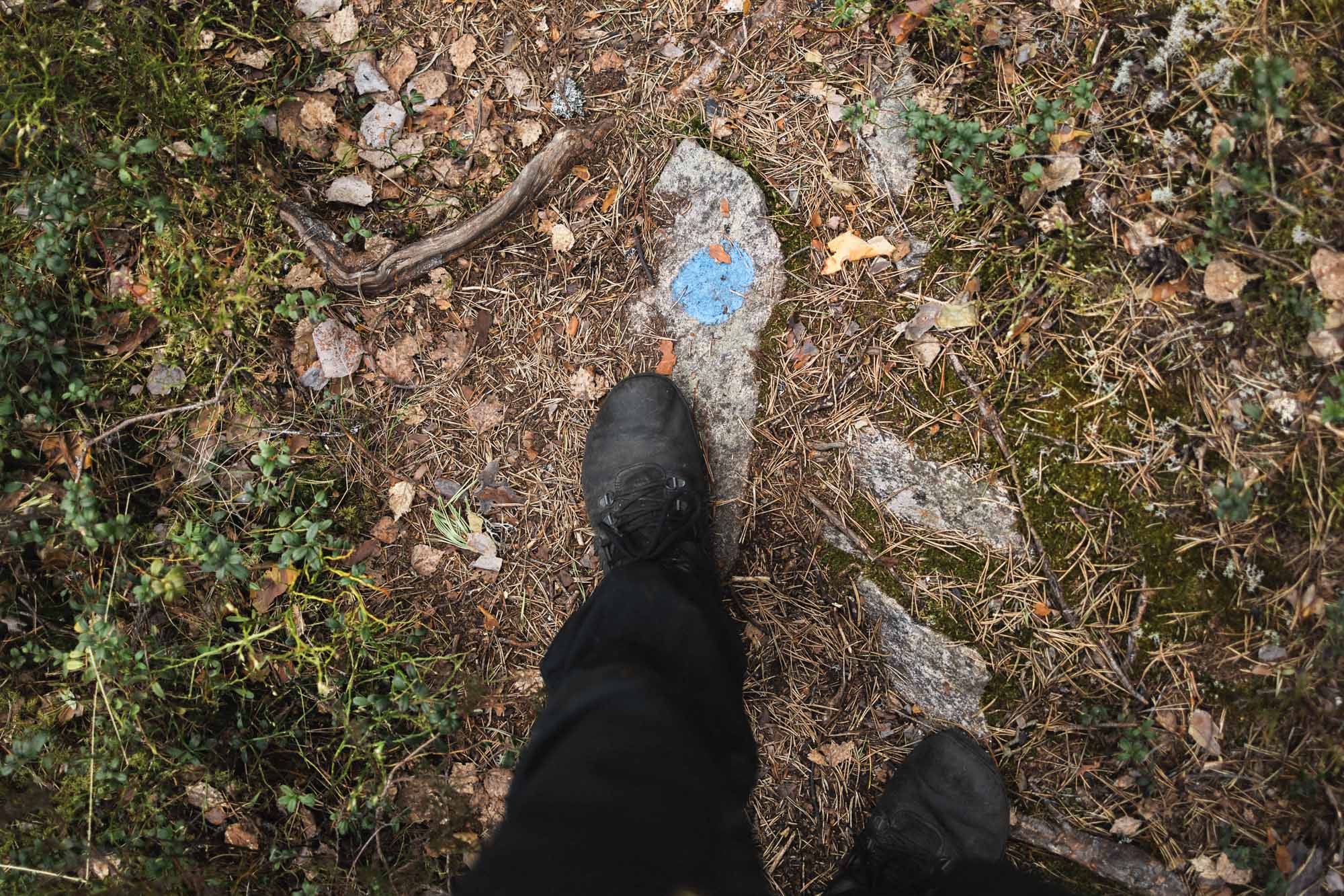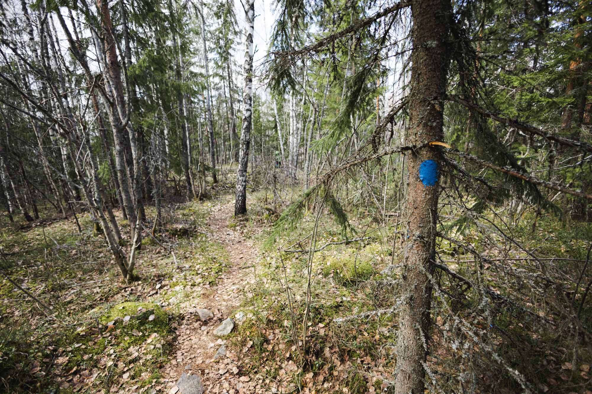 Hiukan laavulta eteenpäin polku erkani Hiijje silmukasta kohti Hiidenmaata ja näytti nyt selvästi vähemmän kuljetulta. Reitti oli kuitenkin edelleen hyvin merkattu kivissä ja puissa oleville sinisillä täplillä. Hiljaisempi osuus sopi meille erittäin hyvin, sillä ehkä nyt voisimme nähdä enemmän eläimiä. Toivelistalla olivat ainakin hirvi, kettu, jänis, korppi ja myöhemmin vesillä norppa, sillä Luonteri on saimaannorpan keskeistä elinaluetta.