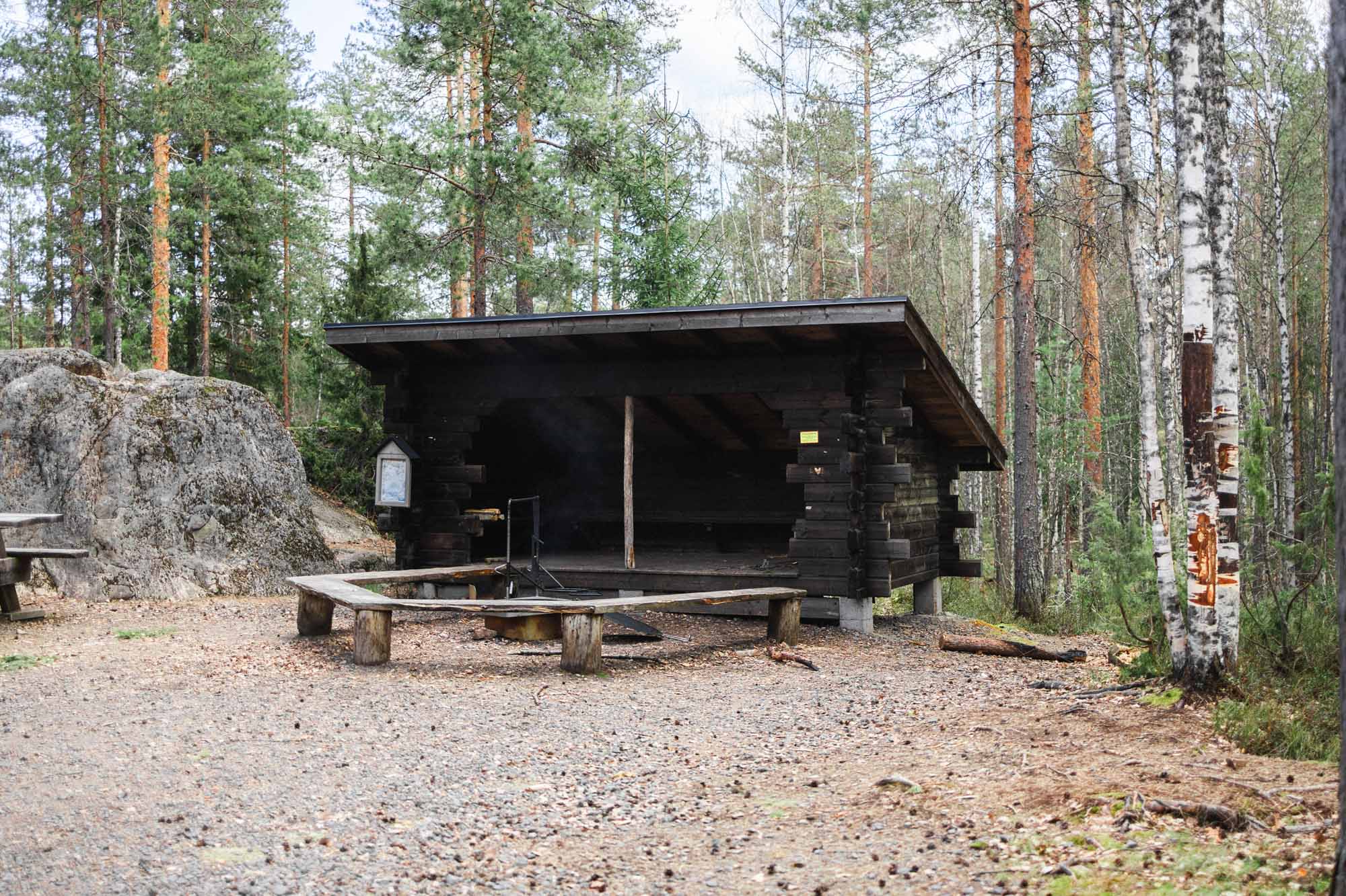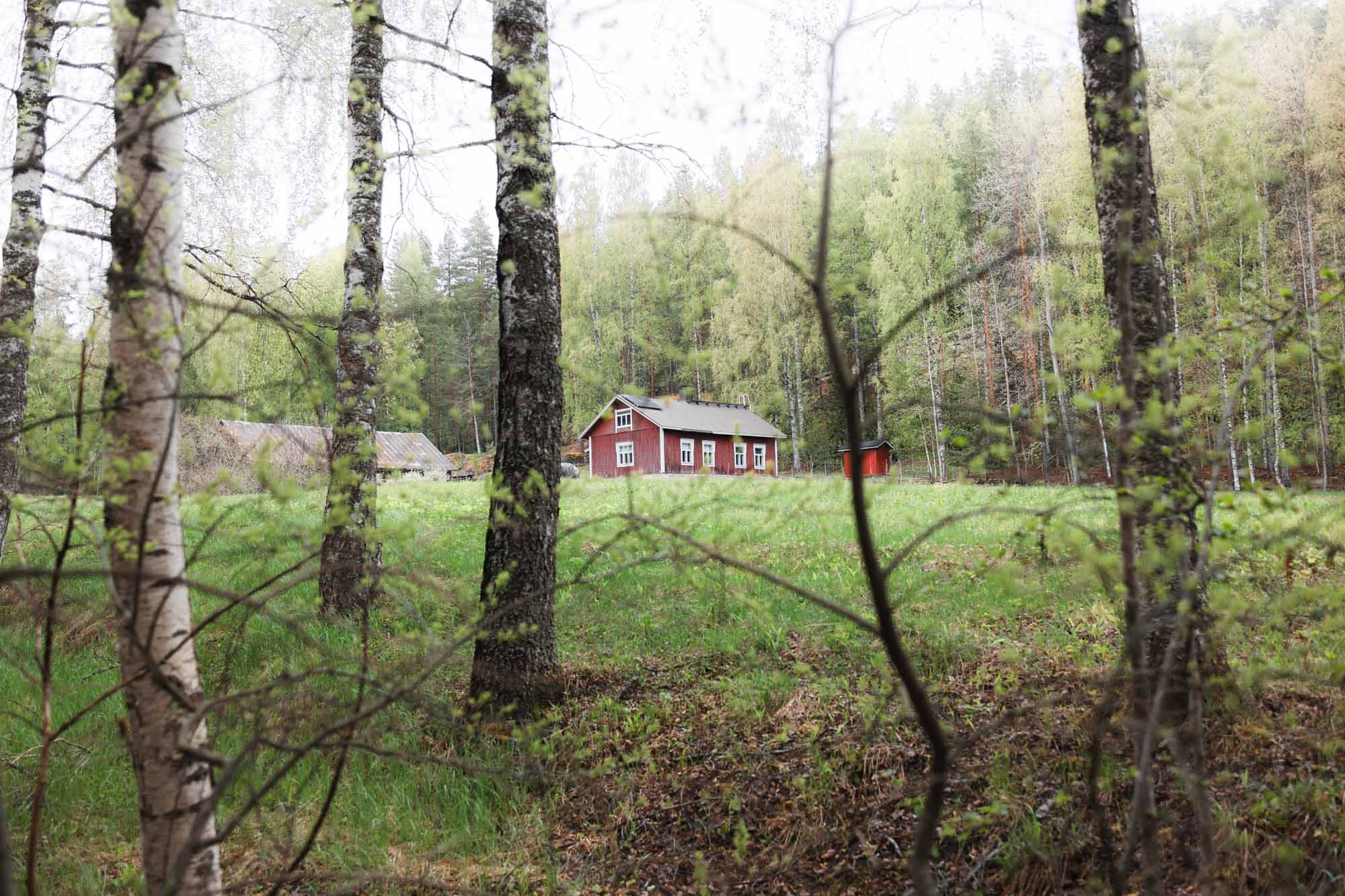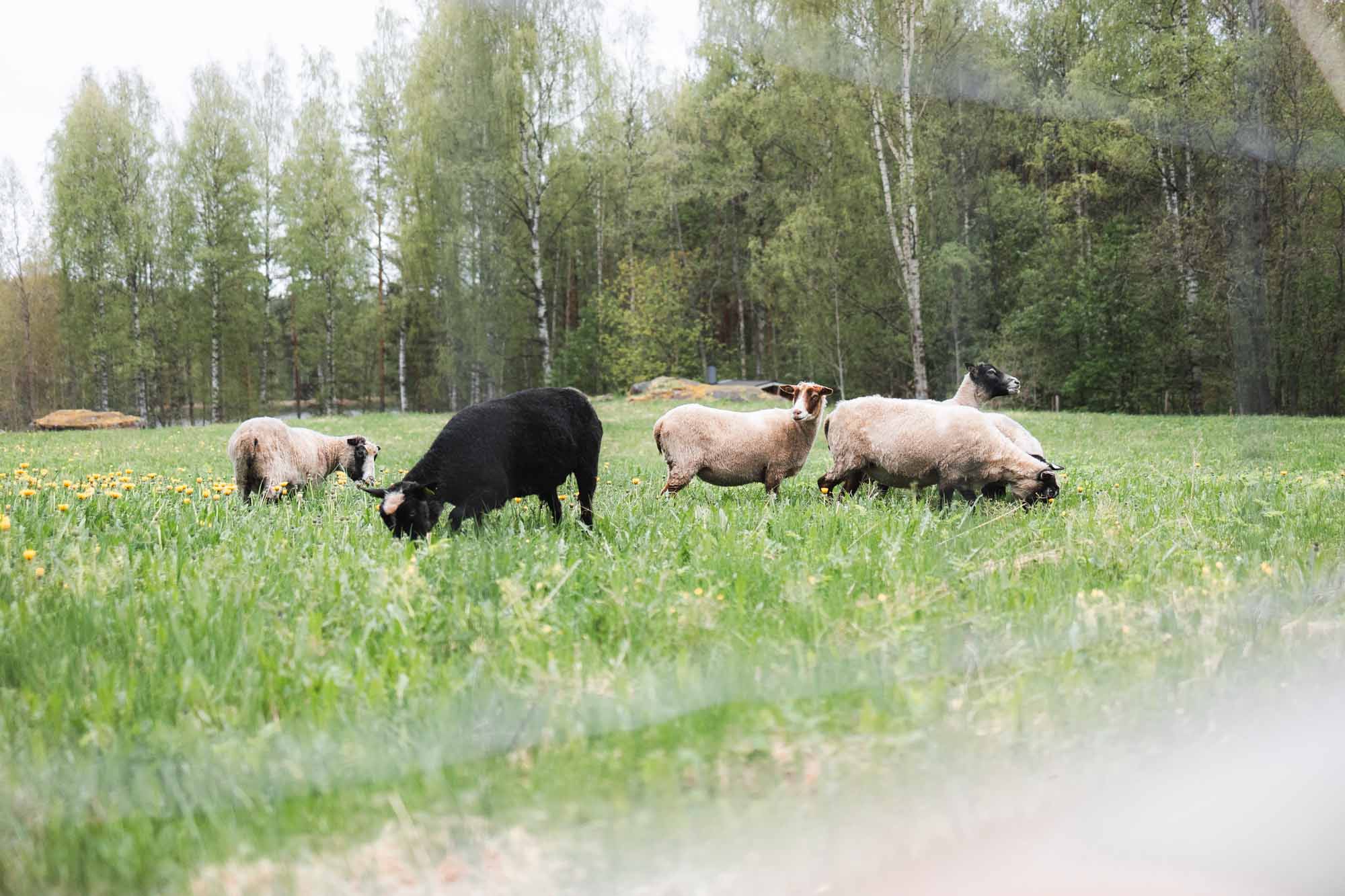 Parkkipaikan jälkeen edessä alkoi avautua perinteistä maalaismaisemaa. Riukuaidalla kehystetyn pihatien päässä oli punainen hirsimökki, jonka ympärillä vihreät niityt hohtivat kirkkaana aamun valossa. Nurmea hoitamaan oli saapunut lampaita, ja mökki onkin yksi Metsähallituksen lammaspaimenviikkokohteista.