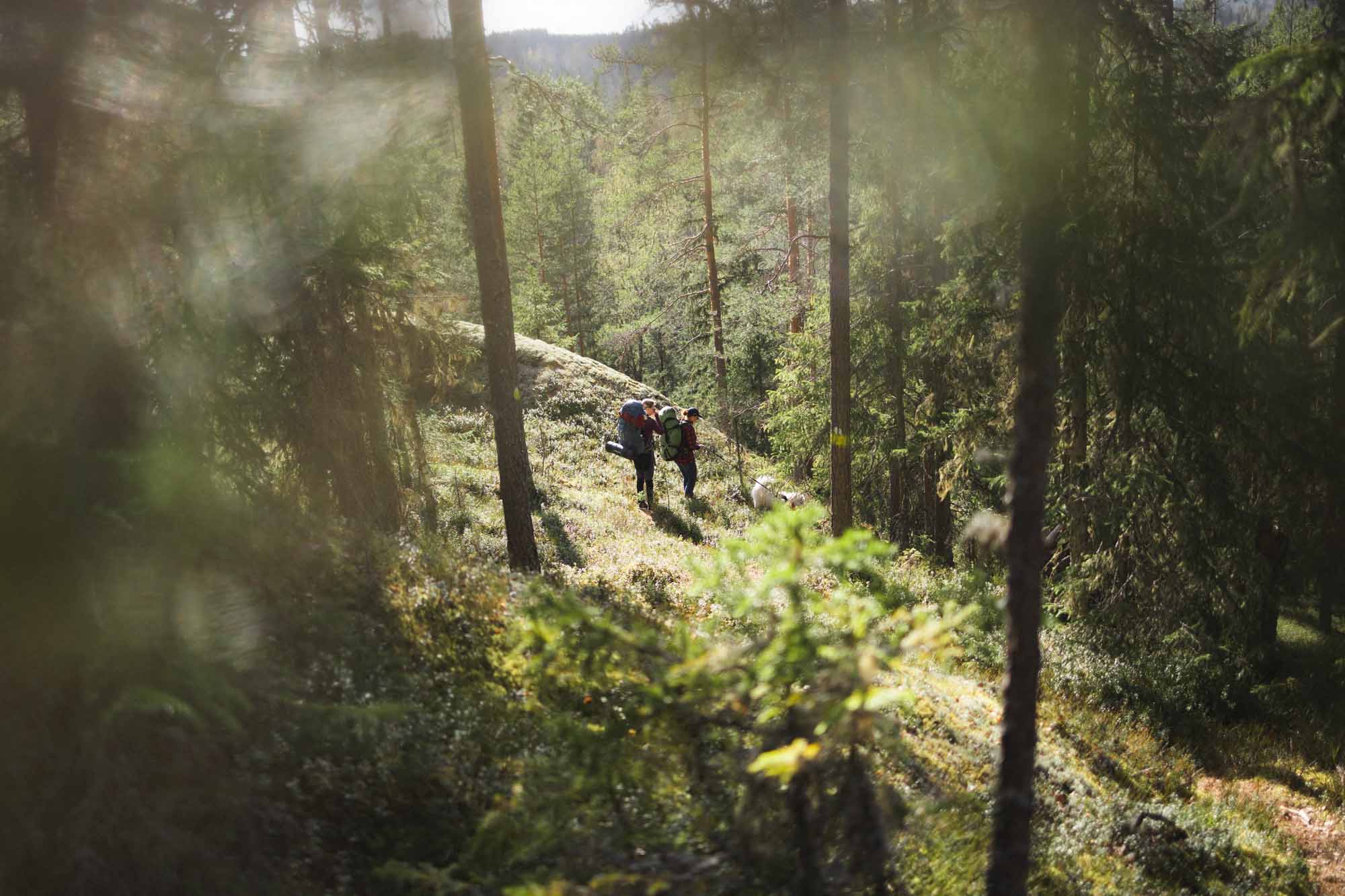 Jyrkän laskun jälkeen varjoja edessä olevaan laaksoon loivat tuulessa narisevat naavaiset kuuset ja sammaleen peittämät kallioiset rinteet. Täällä luonto muuttui kosteammaksi, lehtomaiseksi metsäksi, jossa voisi varmasti pian keräillä kantarelleja paistettavaksi leivän päälle.