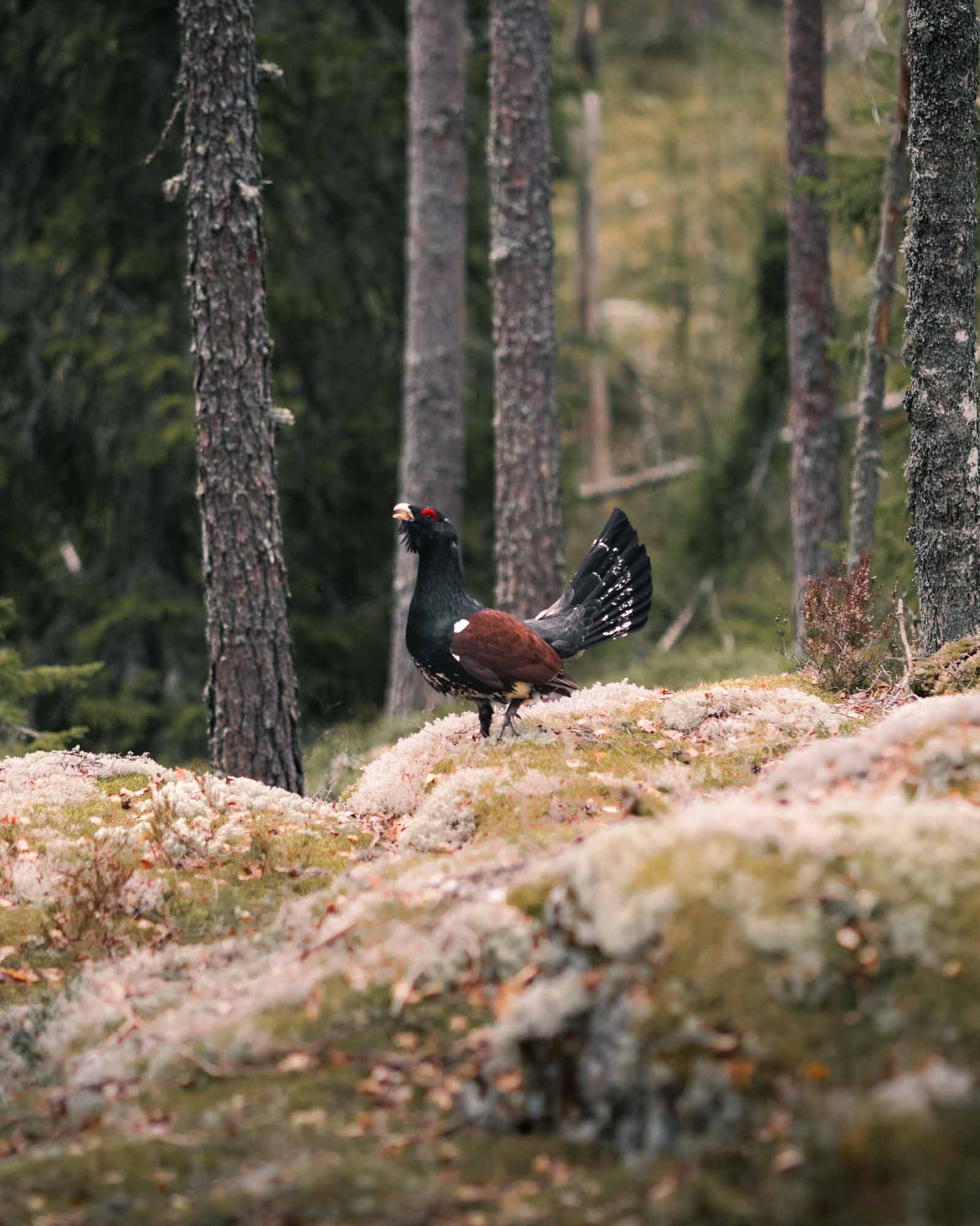 Ehkä 30 metrin päässä meistä naksutteli Metso, ja katsoi tunkeilijoita tuimasti pää pystyssä. Sirkku tarkkaili vanhaa homenokkaa kiinnostuneena, mutta ei sentään onnistunut pelästyttämään lintua, ja sain siivekkäästä onneksi napattua kuvankin ennen kuin se lensi piiloon läheiseen männikköön.