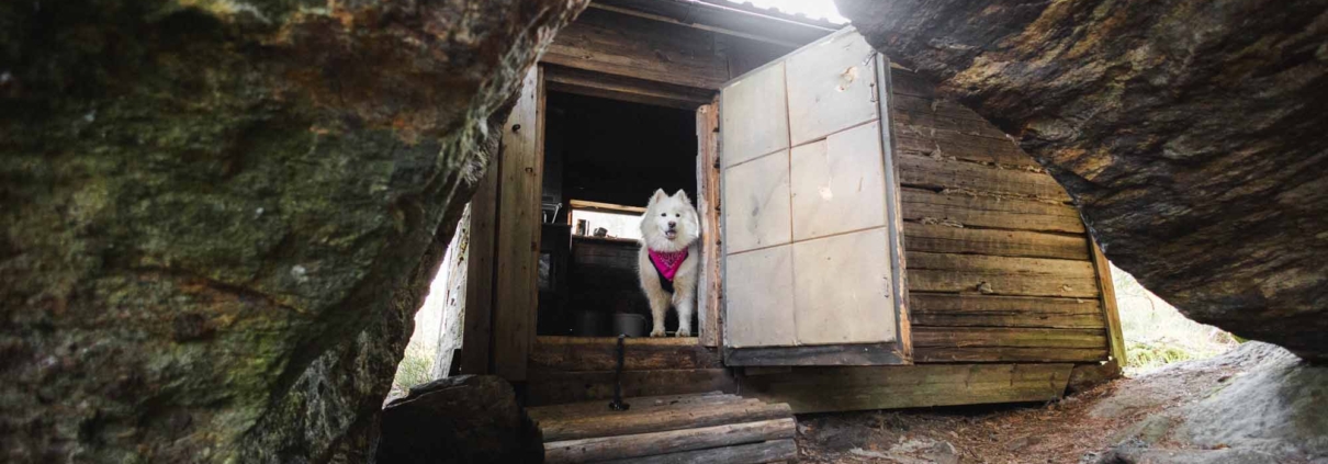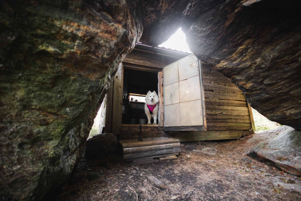 Kodan kattoon oli viritelty lyhtyjä, ja hyllyiltä löytyi kattava valikoima elintarvikkeita ja astioita. Polttopuitakin löytyi hyvin, joten tässä oli mainio tilaisuus paistaa makkarat ja valmistaa jälkiruoaksi klassikko: suklaabanaani. Sirkku oli sitä mieltä, että hänkin on ansainnut vähän makkaraa, ja saikin pienen palasen.