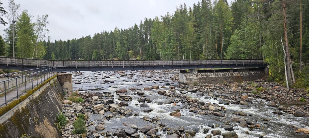 Tältä paikka näyttää nyt ylävirran puolelta. Pato on suurimmaksi osaksi purettu. Edellisellä käynnilläni ihmettelin, miten koski mahdetaan ylittää kun pato puretaan. Vastaus: hienoa kävelysiltaa pitkin.