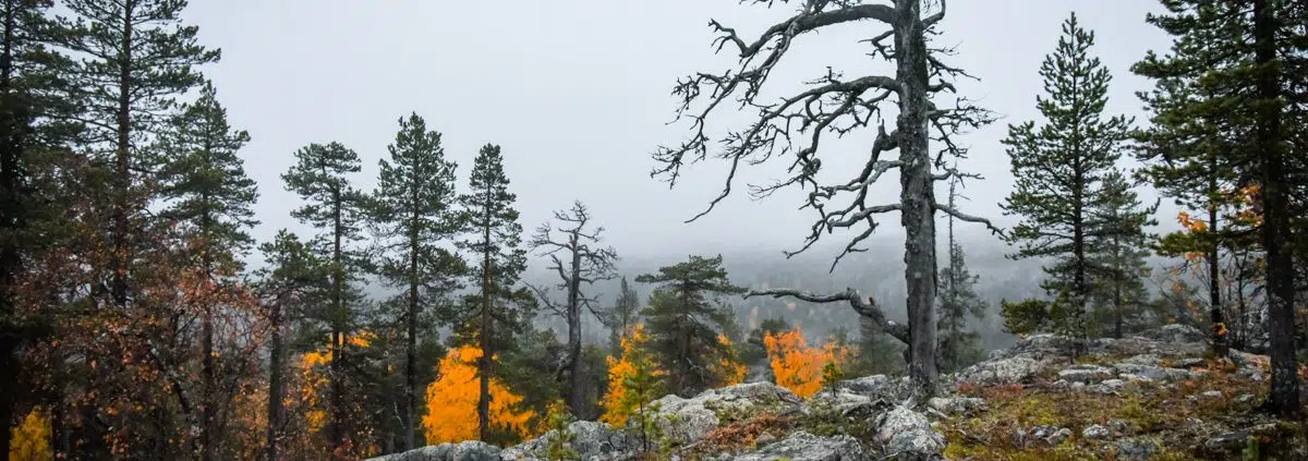 Reitti vaikutti olevan selkeä ja suhteellisen hyvin merkitty. Lapin ilma oli täynnä happea ja kosteutta. Sateen uhkaa ei tuntunut, mutta sumu syleili vaaroja ja toi tuoksuvaan metsään unenomaisen tunnelman illan hämärässä.
