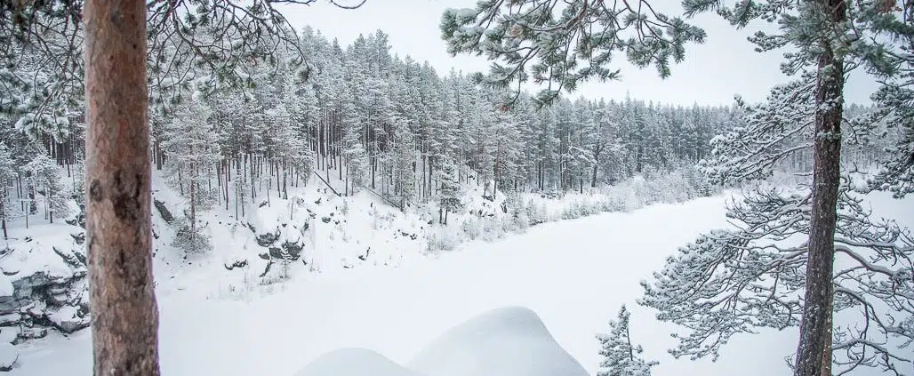 Koski on huumaavan hiljainen, vain valkoinen suuri ura ja repeämä joka metsää mutkitellen halkoo. Jopa tämä kuohuva jättiläinen on nöyrtynyt ja hiljentynyt talven kourissa. Hyvä niin, hyvä, että joki lepää talviuntaan jään ja lumen alla. Koska seuraavana päivänä olisi pakkanen vyörymässä sen päälle, silloin eivät nämä 15 astetta ole enää mitään, vaan tulossa on ainakin 30 pakkasastetta…