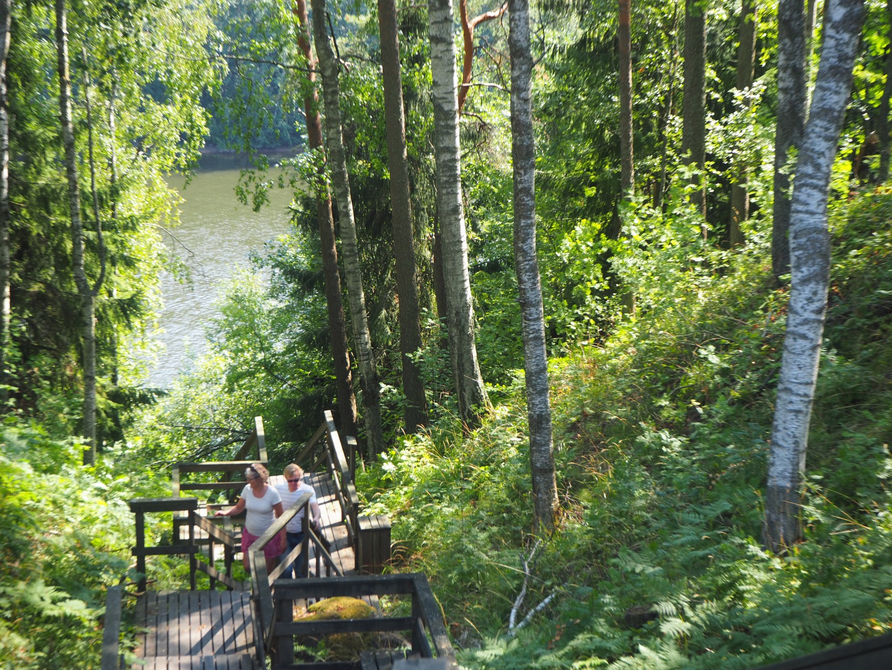 Puiden lomasta pilkottelee Kymijoki. Laskeutuminen noin 150 porrasta alas joen varteen tekee hyvää automatkan puuduttamille jaloille.