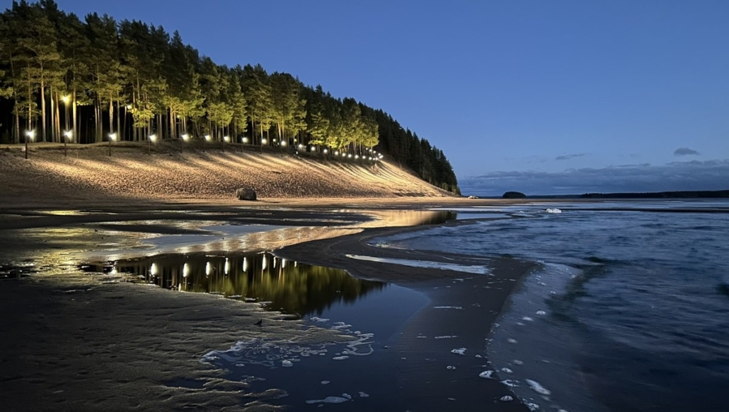 - Kohokohdat: Hiekkaranta, Sapsojärven rantatörmä, maisema järven yli ja valaistus pimeään vuodenaikaan