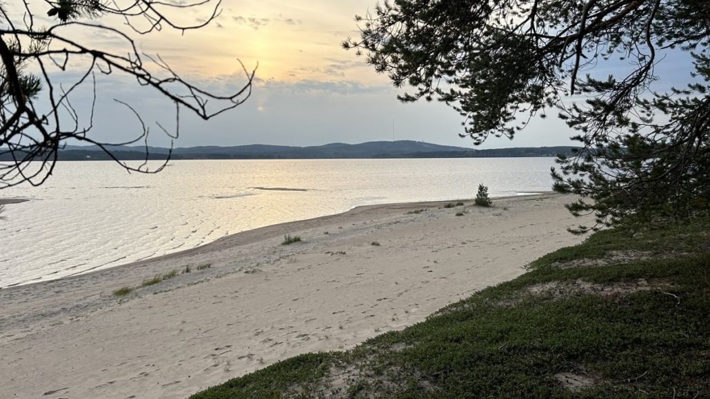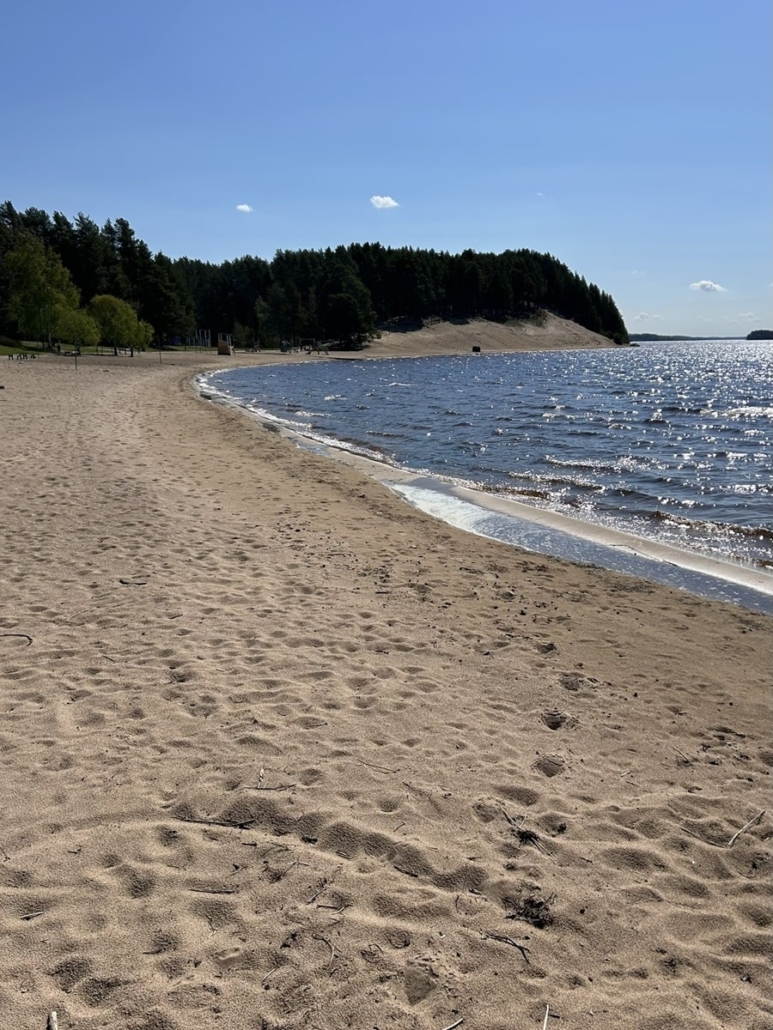 Laiturilta tutustumisretki jatkuu kohti rantatörmää. Kannattaa lähteä kulkemaan hiekkatörmän alla rantaviivaa seuraten. Hiekka on hienoa ja houkuttaa kävelemään avojaloin tai kirmaamaan vesirajassa.