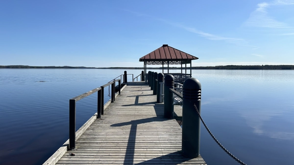 Mukavan ensitutustumisen Hiukkaan saa suuntaamalla pesäpallostadionin takaa oikealla näkyvälle laiturille, jonka päässä on katettu suoja. Sieltä kelpaa ihailla maisemia vähän sateisemmallakin kelillä.